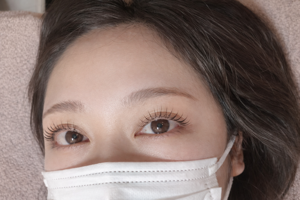根元が立ち上がることで、まぶたも一緒にリフトアップされ、目がぱっちり大きく見える効果があります。さらに、白目に光が入りやすくなるため、瞳がキラキラと輝いて見えるのも嬉しいポイント。持続期間は約4〜5週間と長めで、忙しい方にもぴったりの施術です。